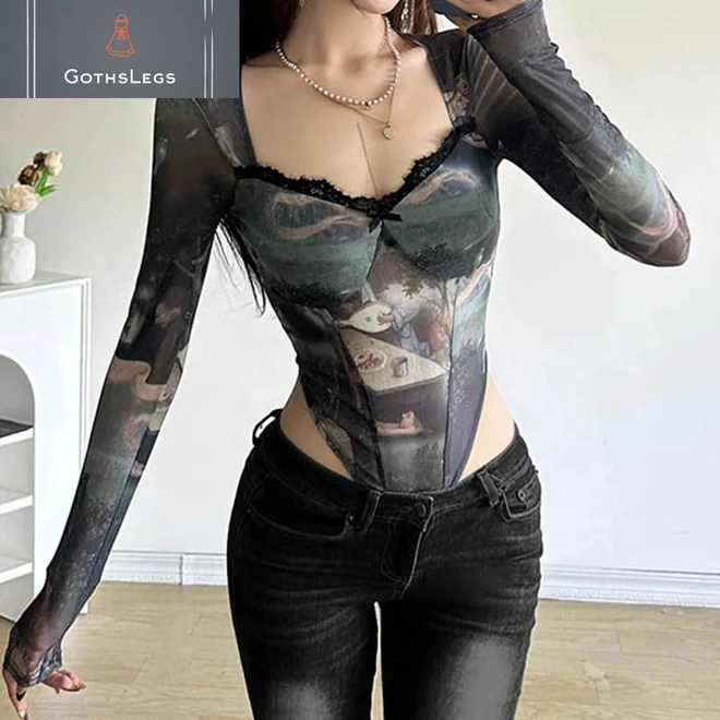 The GothsLegs Goth Dark 90s Retro Print Mesh Long Sleeve Skinny Bodysuit is a stunning blend of vintage nostalgia and modern edge, perfect for those who embrace the gothic and Y2K aesthetic. This bodysuit features a sheer mesh fabric with intricate lace patchwork, creating a bold and unique look thatâs both daring and elegant. The long sleeves and fitted design offer a sleek, flattering silhouette, while the retro-inspired print adds a touch of 90s charm. Ideal for streetwear or cyber-inspired outfits, this piece is versatile enough to be dressed up or down for various occasions. The attention to detail in the lace and patchwork design ensures a high-quality finish, making it a standout addition to any wardrobe. Whether youâre channeling gothic vibes or embracing the Y2K revival, this bodysuit is a statement piece that exudes confidence and style. Its lightweight and breathable mesh material ensures comfort, while the skinny fit hugs the body for a seamless look. Perfect for layering or wearing on its own, the GothsLegs Goth Dark Bodysuit is a must-have for anyone looking to elevate their gothic or retro-inspired wardrobe with a touch of modern flair.