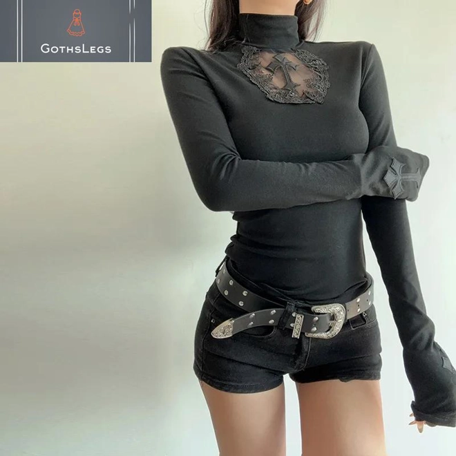 GothsLegs presents the Goth Dark Elegant Fashion Mesh Patchwork Cross T-shirt, a stylish and versatile addition to any wardrobe. This slim-fit turtleneck pullover is designed for women who appreciate a blend of elegance and edgy fashion. The sheer mesh fabric offers a unique look, perfect for layering or wearing on its own for a bold statement. The intricate patchwork design features a striking cross motif, making it an ideal choice for those who embrace a goth aesthetic. This T-shirt is reminiscent of 90s E-girl fashion, appealing to trendsetters who want to stand out. The lightweight material ensures comfort, while the turtleneck adds a touch of sophistication. Available in various options, this top can be paired with skirts, jeans, or shorts for a complete look. Whether you're heading to a casual outing or a themed event, the Goth Dark Elegant Fashion Mesh Patchwork Cross T-shirt is sure to turn heads. Embrace your individuality and express your unique style with this must-have piece from GothsLegs, designed for those who dare to be different.