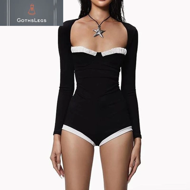 GothsLegs presents the ultimate fusion of dark allure and contemporary fashion with their Goth Dark Y2K Party Long Sleeve Bodycon Playsuits. Crafted for the modern goth, this playsuit embodies the essence of both gothic and Y2K aesthetics, making it a standout choice for any party or event. The long sleeves and bodycon fit ensure a figure-hugging silhouette that exudes confidence and style. The patchwork design adds a unique touch, blending various elements to create a visually striking piece. Perfect for women who embrace their individuality, this playsuit is not just clothing; it's a statement. The square neck design offers a balance between edginess and sophistication, while the streetwear-inspired shorts bodysuit ensures comfort and versatility. Whether you're heading to a club, a themed party, or simply looking to make a statement on the streets, this playsuit is designed to turn heads and keep you comfortable. GothsLegs has once again delivered a product that captures the spirit of goth fashion, combining dark elegance with modern trends to create a must-have item for any fashion-forward wardrobe.