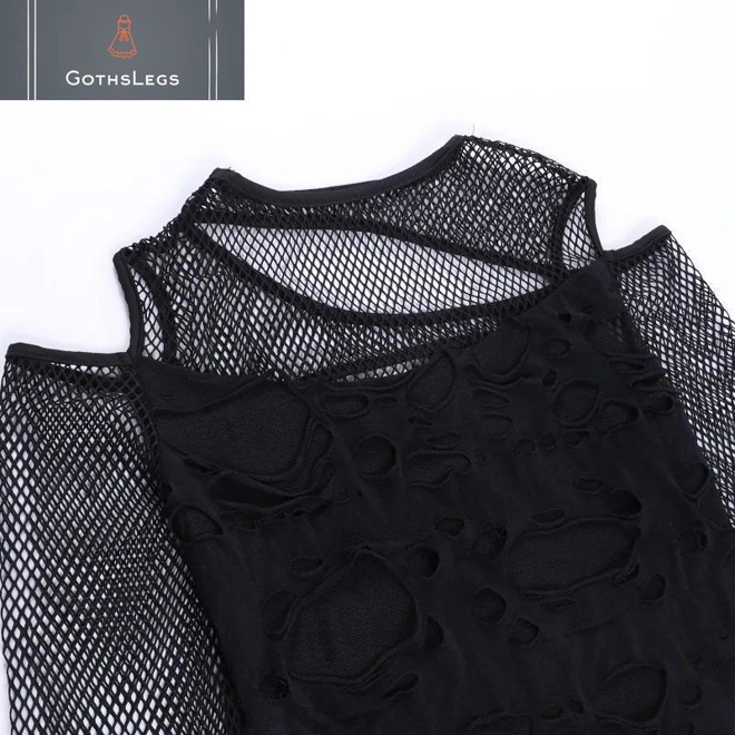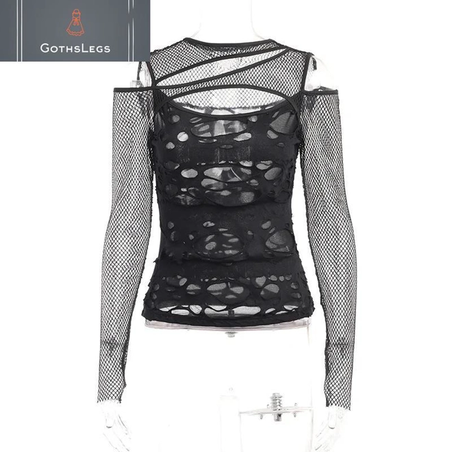 GothsLegs presents the Goth Dark Frayed Mall Gothic Hollow Out T-shirt, a striking addition to any alternative wardrobe. This long-sleeve top features a unique grunge punk design, combining fishnet patchwork with a stylish hollow-out detail that enhances its edgy appeal. The shirt is crafted from high-quality materials, ensuring comfort and durability while making a bold fashion statement. Its frayed edges add a touch of rebellious charm, perfect for those who embrace a non-conformist style. The versatile design allows for easy pairing with various bottoms, from distressed jeans to skirts, making it suitable for casual outings or more daring events. Available in multiple images showcasing different angles and details, this top is designed to cater to the tastes of modern streetwear enthusiasts. The Goth Dark Frayed Mall T-shirt is not just a piece of clothing; it’s a reflection of individuality and self-expression. Ideal for layering or wearing alone, this blouse is a must-have for anyone looking to elevate their alternative fashion game. With its sexy silhouette and unique design elements, this top is sure to turn heads and make a lasting impression wherever you go.